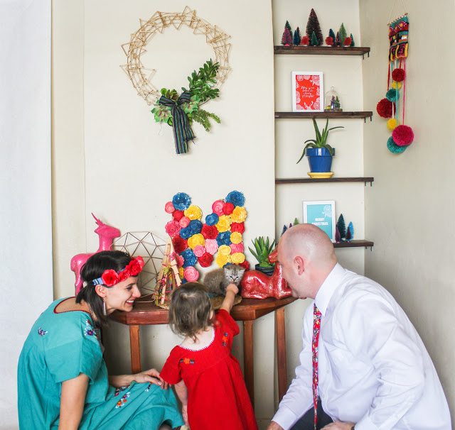 To go with the ethnic bright feel of the concept Nora and I are wearing traditional dresses from Flor De Luz Shop which is owned and ran by a local friend and shop. I simply love this shop. Jason is wearing a skinny tie from Simply Skinny Ties. I am also wearing jewelry from Musana which is an awesome company that educates and employs Ugandan women. This shop is a great one to support this Christmas. My necklace, earrings, and bracelet are from them.