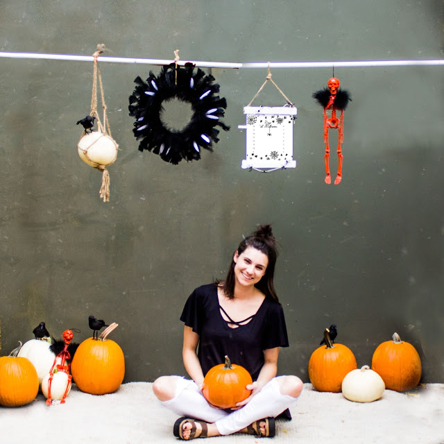 To make the crow feather wreath I purchased a wire wreath frame, tons of black feathers, Marabou Feather Trim Tape-Black, and some white feathers. I first hot-glued the feather trim around the inner rings of the wire wreath. Then I filled in the rest with the loose feathers. Last I hot-glued the white feathers.