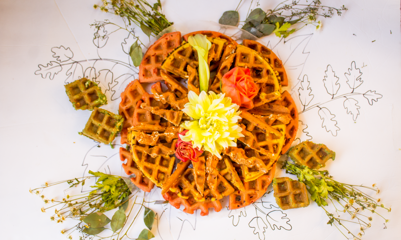 Make waffles with whatever type of iron you have. I have two types so I made heart and round. Use them to cut into shapes like the petals. Dye the dough to get your colors. Voila!