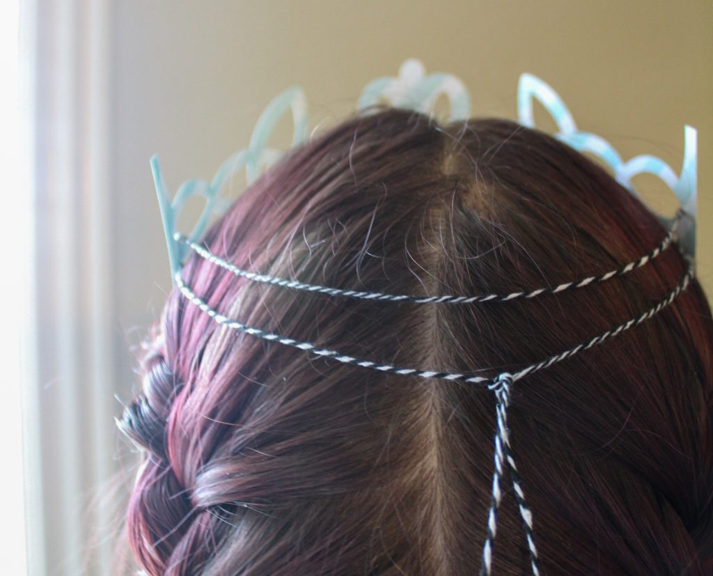 To secure the crown to your head, cut a length of string or ribbon that’s the circumference of your head. Thread your string through the last loops and tie the ends. To wear, both strings go at the back of your head. I like this method because it’s easy to resize, but you can make the back half of the crown however you like.