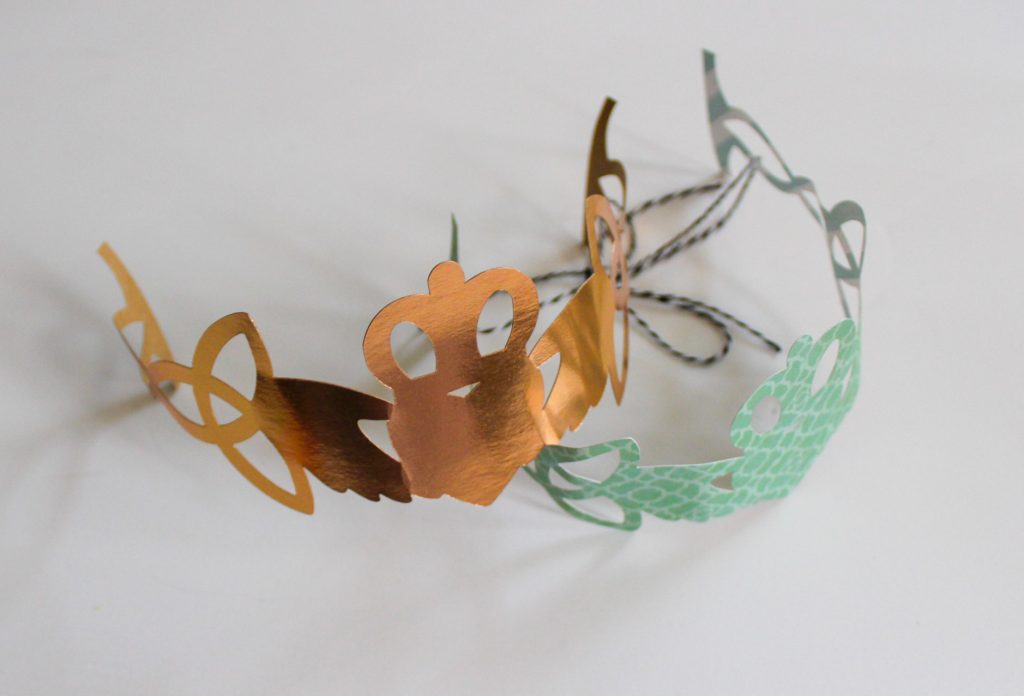 My in-laws have a St. Patrick’s Day lunch every year and this year I was struck with both a need to craft and a boredom with shamrocks that resulted in these easy Claddagh Crowns. The claddagh symbol is an Irish depiction of two hands holding a heart that wears a crown. The hands represent friendship, the hands represent love, and the crown represents loyalty. You’ll find lots of depictions of the claddagh in Irish jewelry and when you wear a claddagh ring, the hand and position indicates your relationship status!
