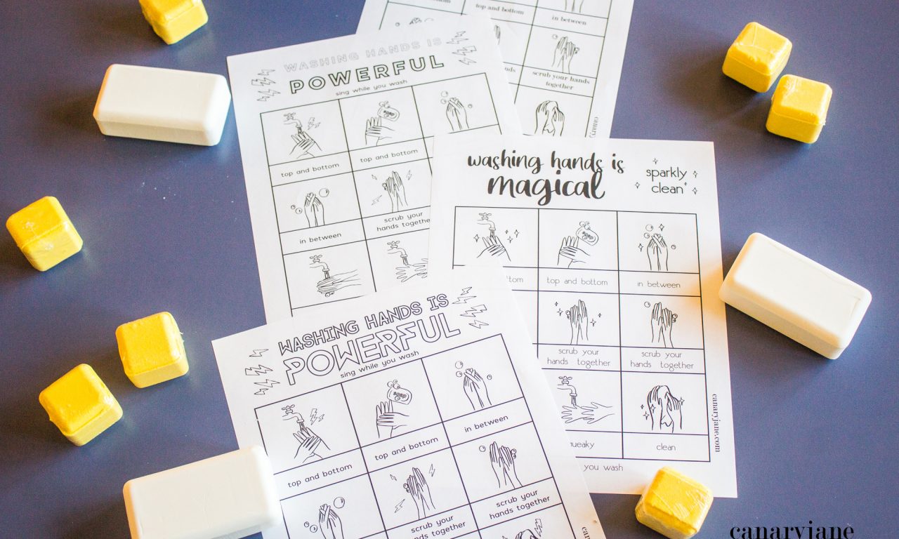 I made five different designs so you can find one that fits your family and kids. I have some “Handwashing is Powerful” ones, a “Handwashing is Magical” one, and some more generic ones. All of them have illustrations with a fun song to sing while you wash that will hopefully help kids remember to wash and do it well.
