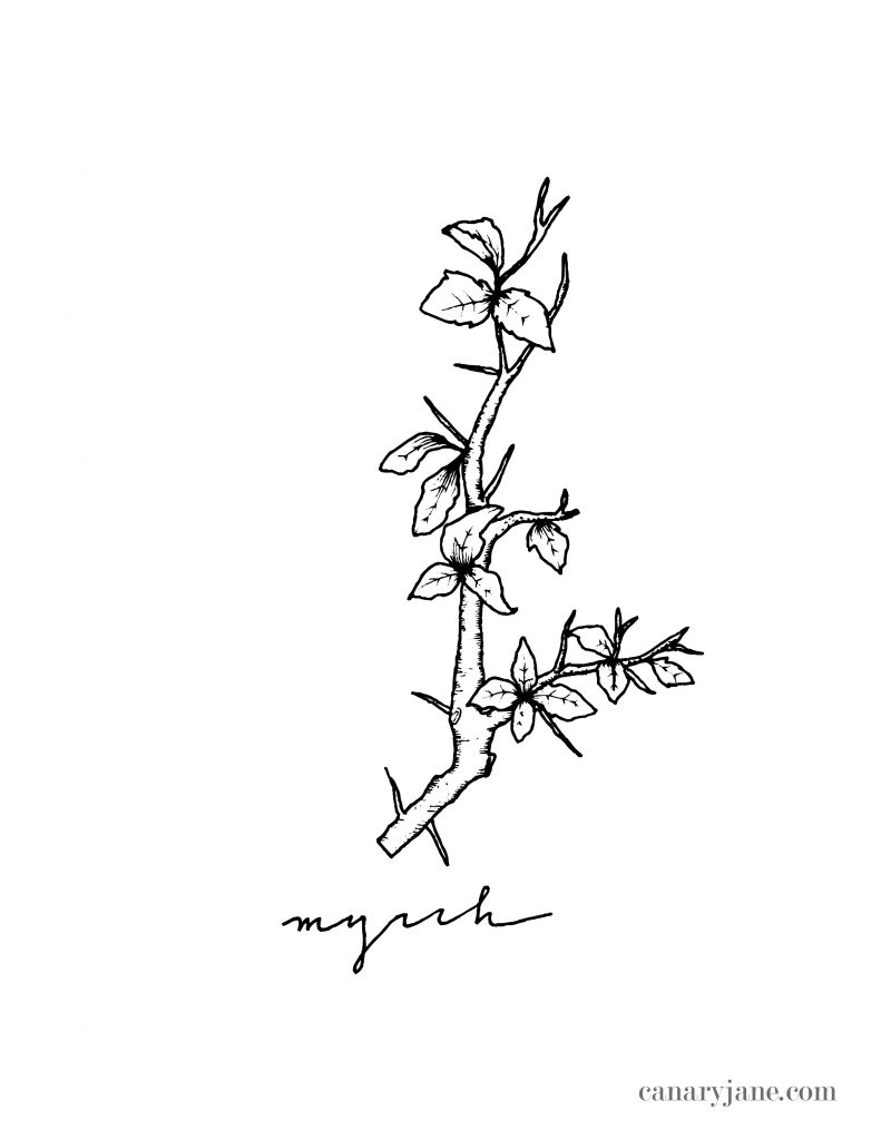 Myrrh is a resin that has been taken from a small thorny tree. You can see the thorns in my illustration. Through the ages myrrh has been used incense, perfume and medicine. If mixed with wine, myrrh can also be consumed also such as the scripture in Mark 15:23 when Jesus is offered drink mingled with myrrh just before his crucifixion.