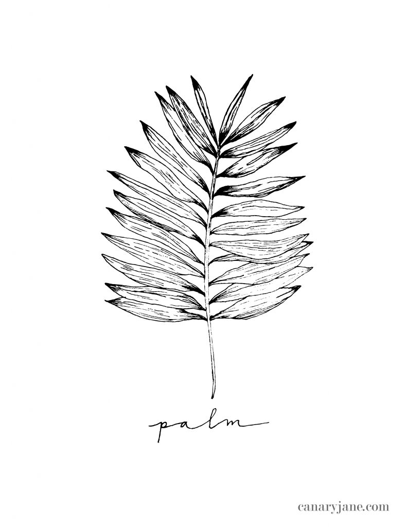 The palm symbolizes victory, triumph, and peace. In Christs life, palm leaves were waved as Jesus entered and walked through Jerusalem. This is called Palm Sunday. Read more here Matthew 21:1–9. Here is illustrated a palm that might have been waved and laid on the ground in honor of Christ.