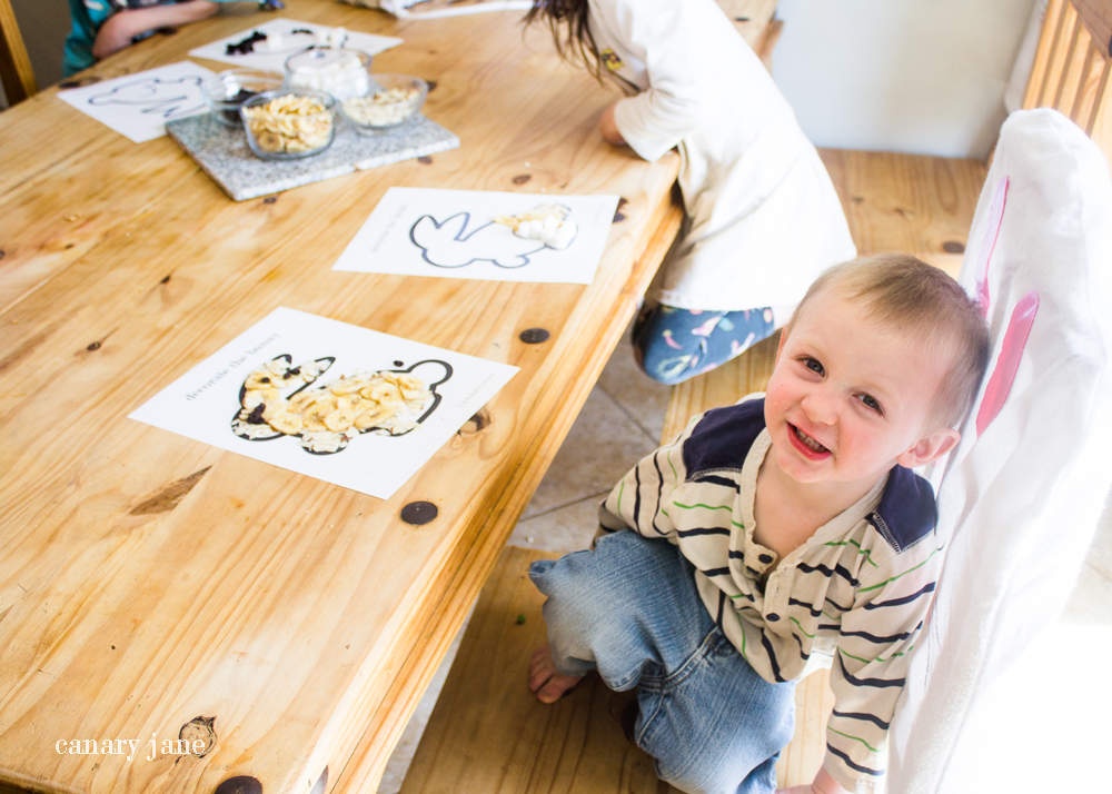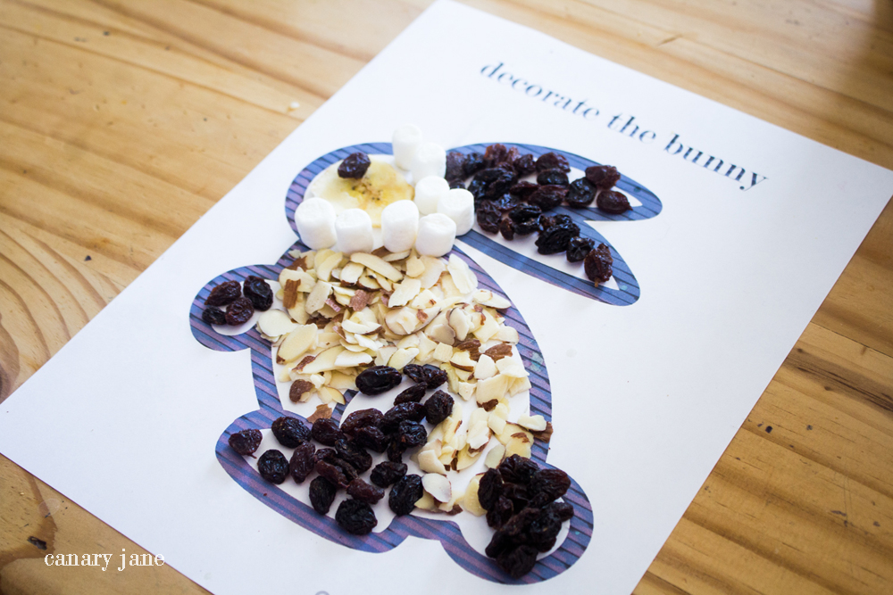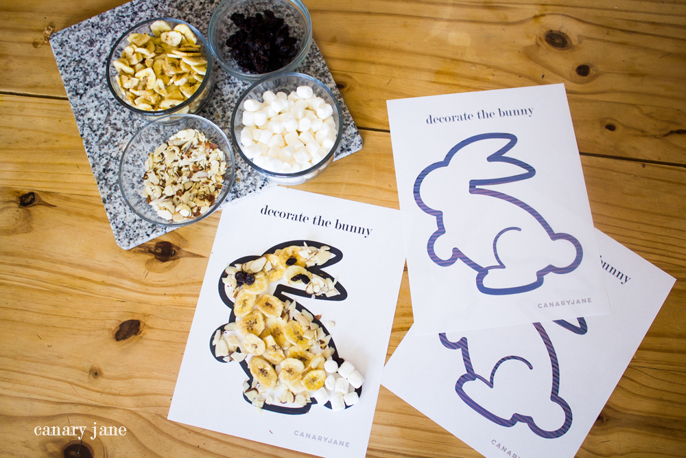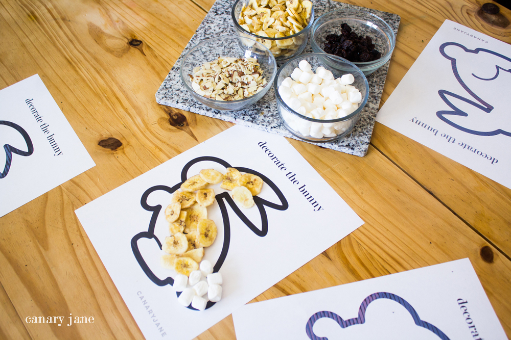 The snacks we used were banana chips, marshmallows, nuts, and raisins but you could do whatever works for your kids. You could also decorate the bunny printable with pom poms, yarn, beans, or beads. Feel free to get creative. Have fun!