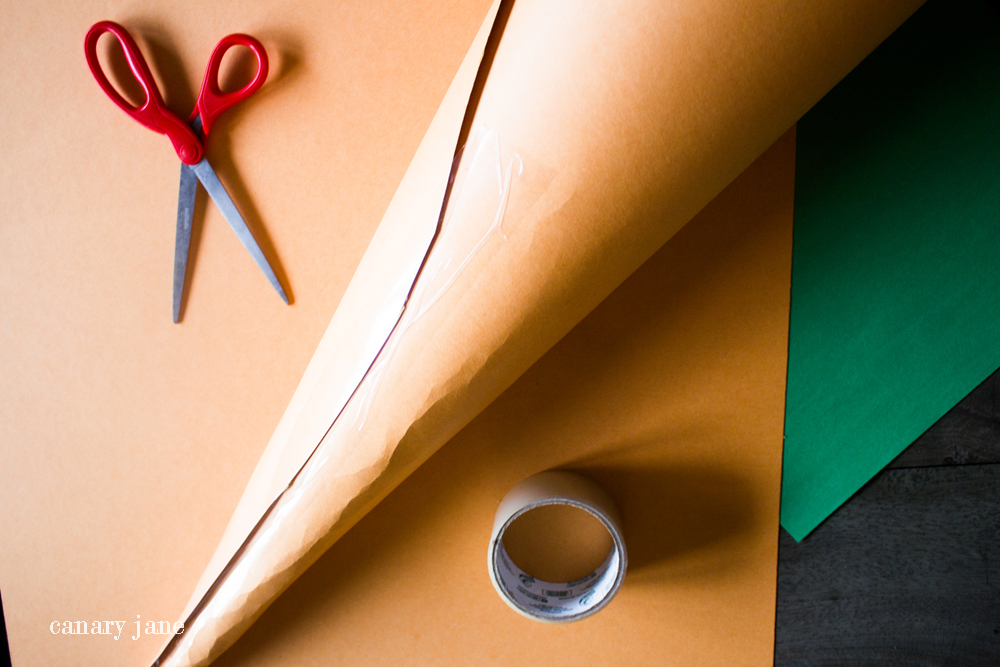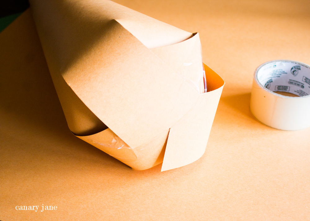 Some tips. If you round your carrot and the top does not line up as pictured below you can cut the top so it is flush. Also feel free to play with the shape before taping. And it helps if you cut a piece of tape and tape it to the seam before rolling if you are doing this solo. Otherwise it may be helpful to have someone help tape as the large paper likes to unroll.