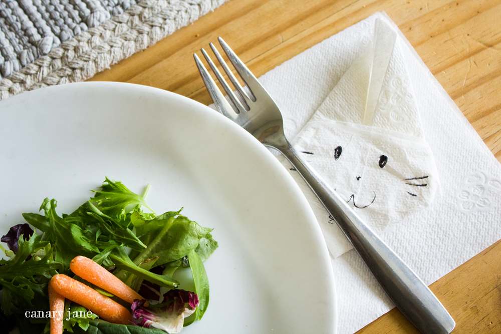 Make and fold these Easter Bunny napkins for Easter dinner. They’re super easy and inexpensive and the kids will love them. They took me a couple minutes to make. But these can also be made pre-Easter watching Netflix. Check out the tutorial below as well as grab our free printables or other fun crafts here.