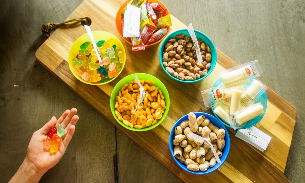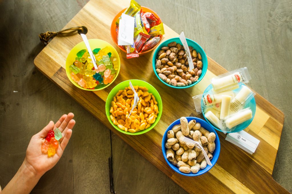 Also for the candy bowls feel free to do fun healthy snacks too, like I did cheese sticks cut in half, sugar coated almonds, and wheat fishes. It doesn’t have to be all sugary treats.