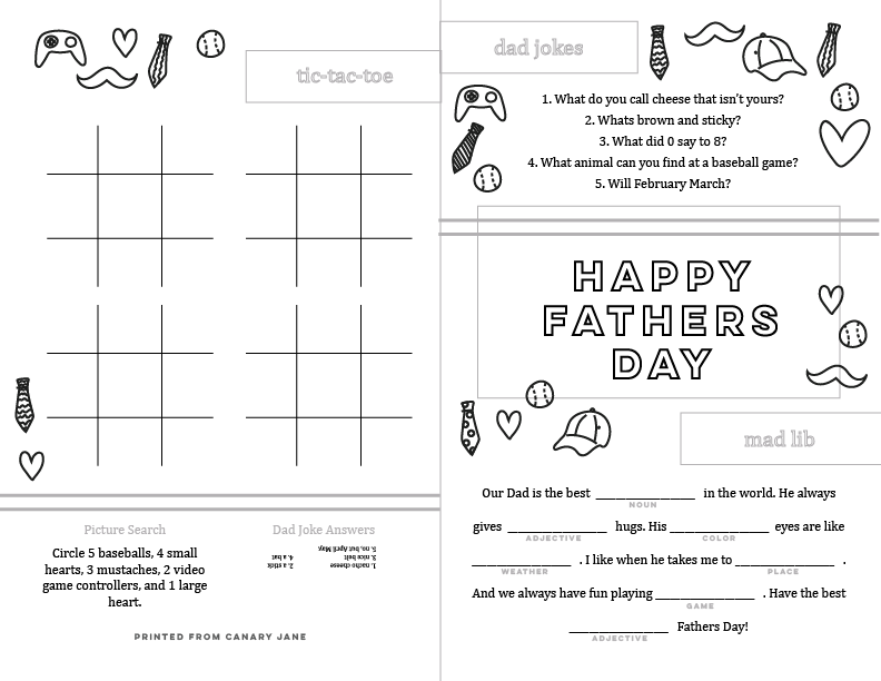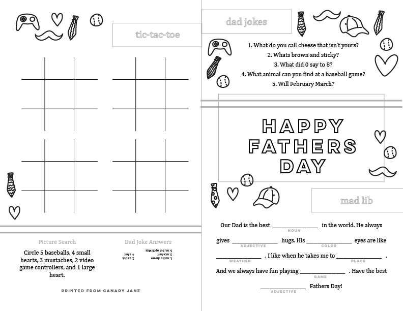 Print off this Fathers Day activity card. This isn’t just a Fathers Day card but an activity sheet with tic-tac-toe, mad lib, dad jokes, and more! Write and draw a picture on the inside and then do then do the activities with your Dad after you give the card.