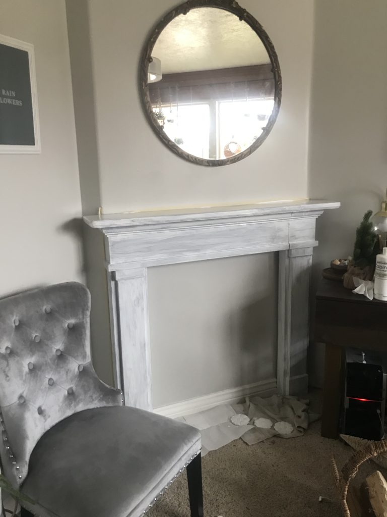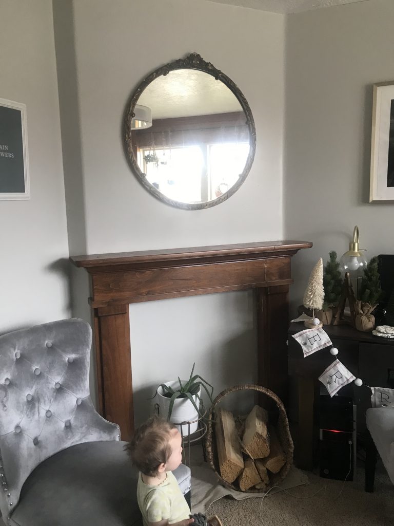 When we were house hunting last year I had really hoped to find a home with a fireplace. When we decided on our home I looked for place to add a mantle since it didn’t have one. And I was excited when this corner screamed for some love. We then found a mantle at a home renovation surplus for $20! The mantle had a warm varnish which, while lovely, didn’t fit our design plans. So we decided to give the whole space a refresh with paint and wallpaper.