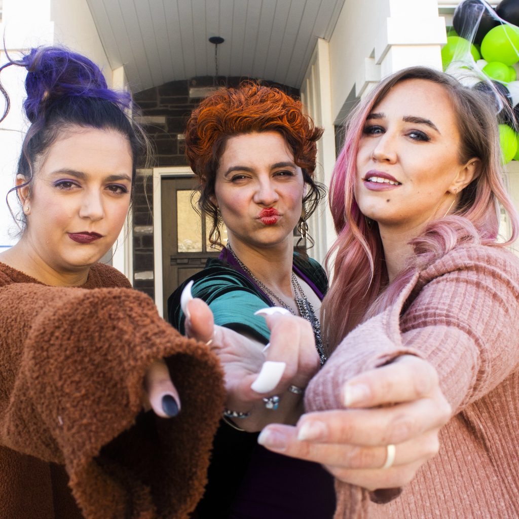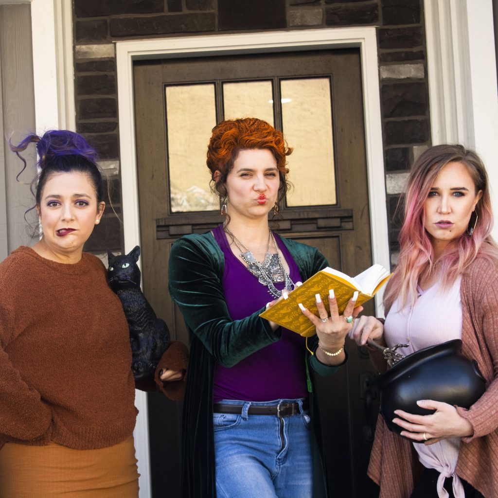 My friends Evi, Steffanie, and I decided to put a modern twist on the Sanderson sisters from the movie Hocus Pocus. Think, if the Sanderson sisters were suburban housewives. For the outfits we used modern inspiration. For the hair and makeup we tried to get it as close as we could to the original ladies.