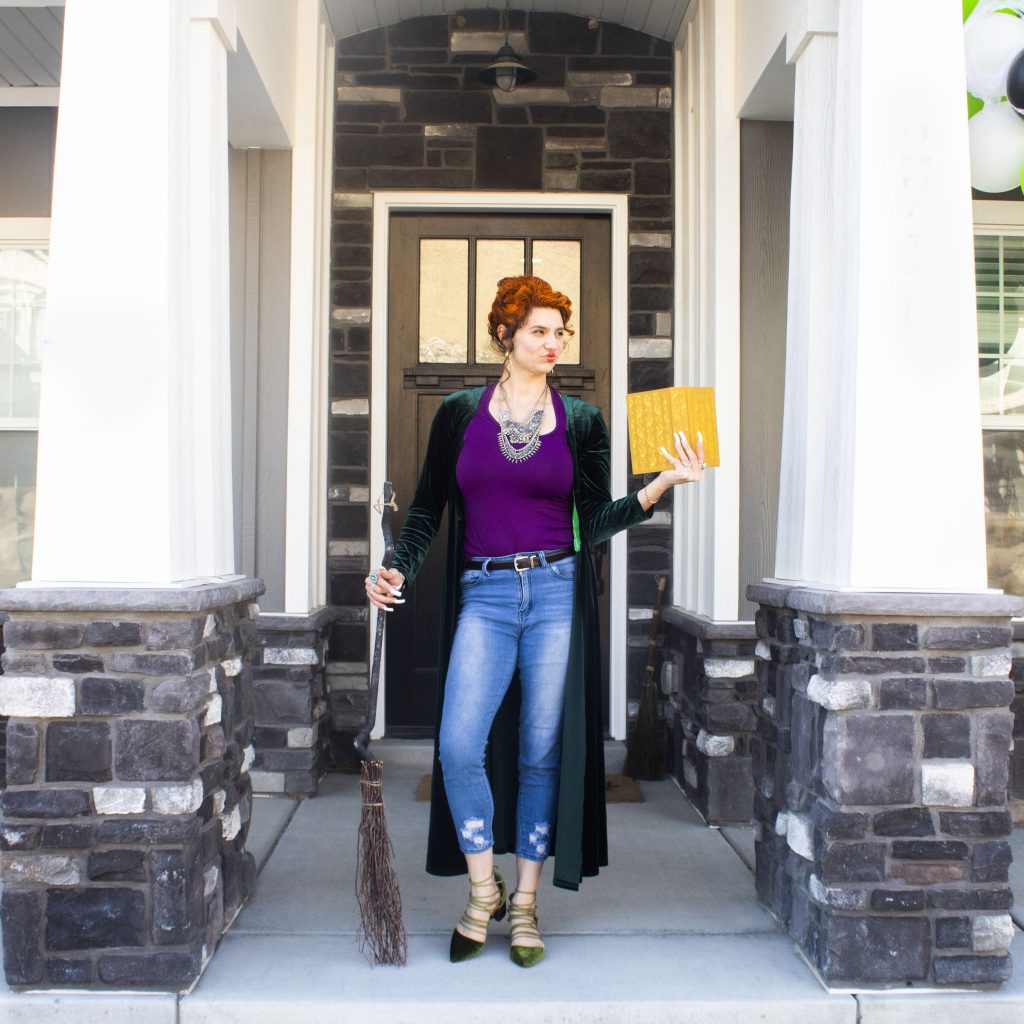 For all our outfits we tried to use pieces we already had keeping with the color schemes of the Sanderson sisters. For reference, Winnifred has purple and green. Mary wore orange, red, and purple. And Sarah wore pinks and reds.