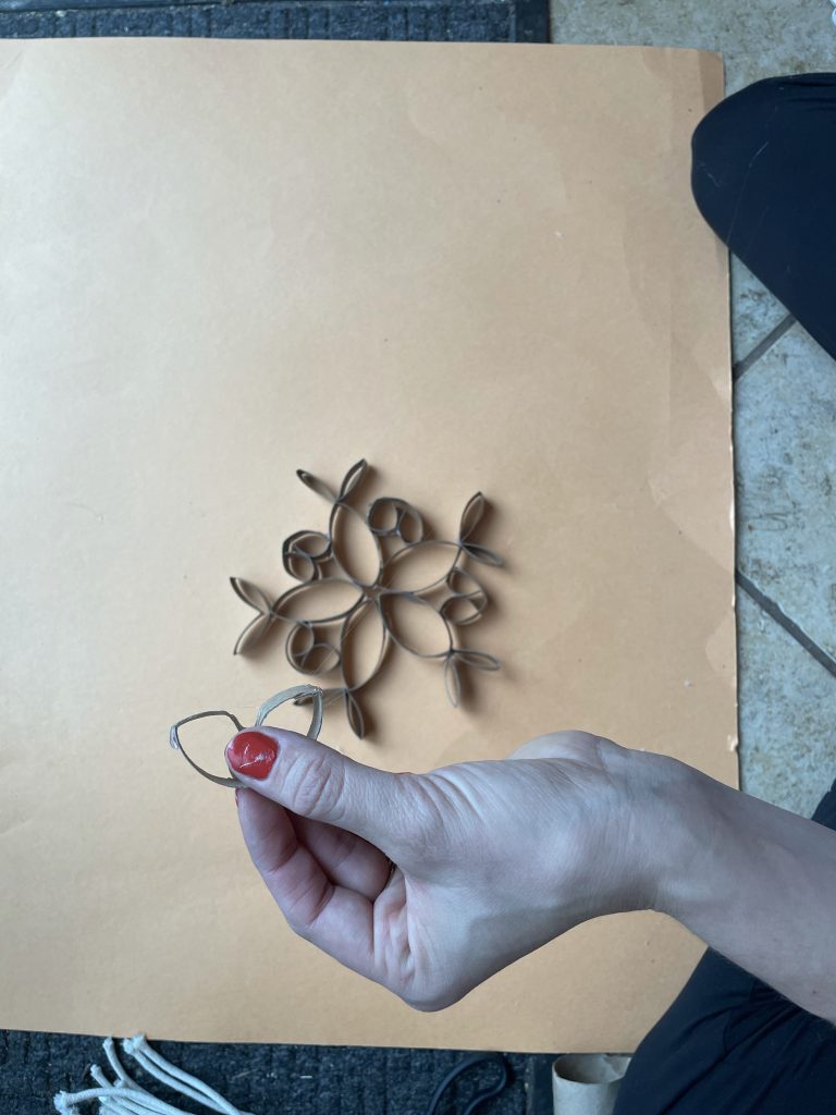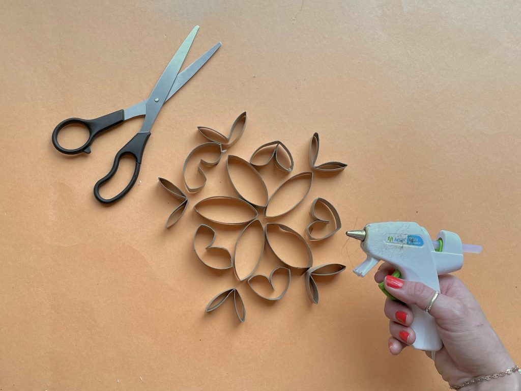 For this design you’ll want at least a few rolls. You can also use wrapping paper tubes (convenient am I right?) or paper towel tubes. For this particular design you’ll need 16 – 1 inch strips,