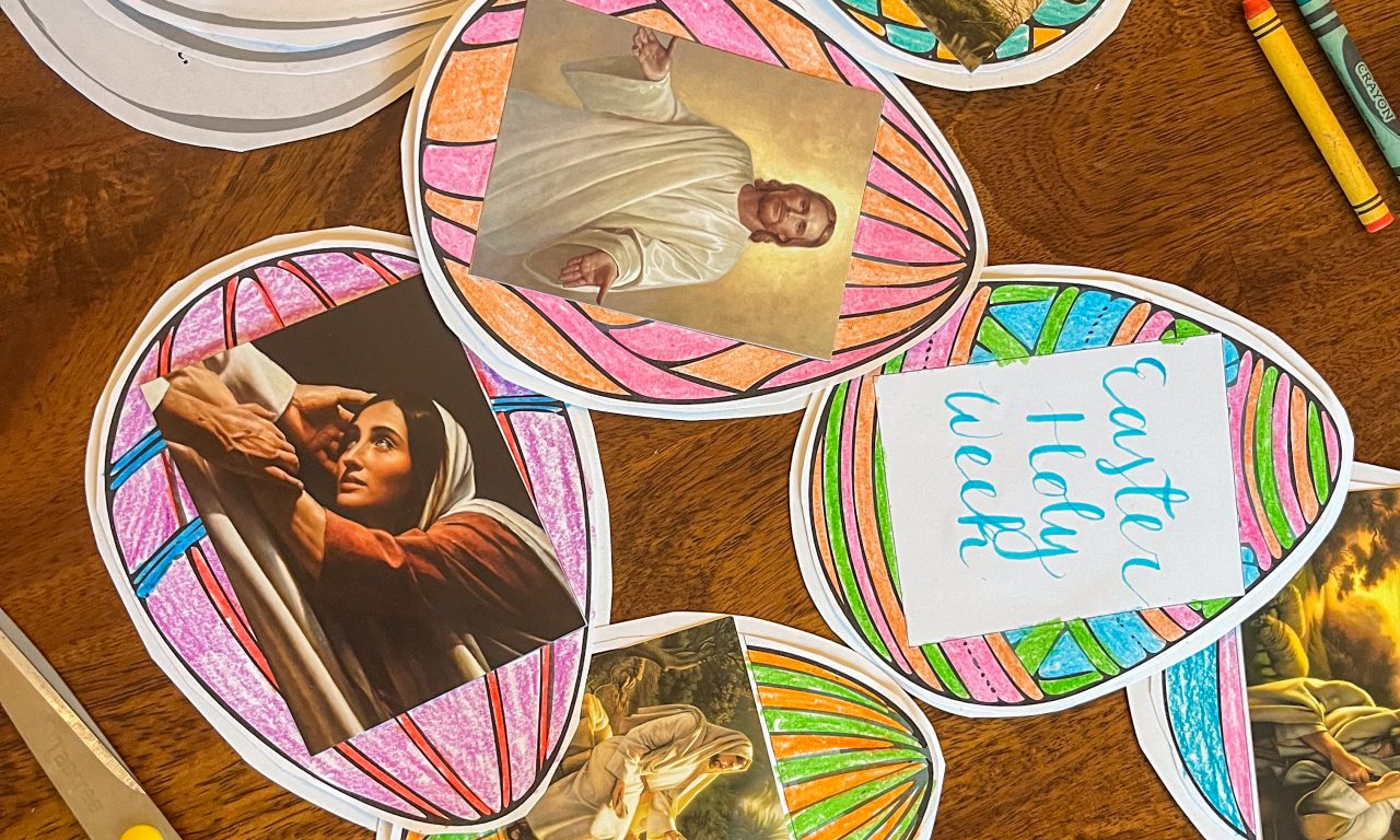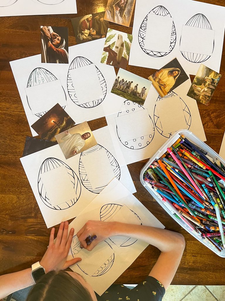These Easter eggs are fun and simple way to teach your kids about the Holy Week. Simply print these eggs off, color, glue together and hang. For the pictures of Christ I used small 3X4 pictures from Deseret Book and Havenlight. You’re welcome to also add your own pictures from online or have your children draw their own. I hung my eggs as a banner as pictured to the left. We hung them on twine with clothes pins so we can see each reading for each day. We also laminated our names and put a date on the back to remember for future years.