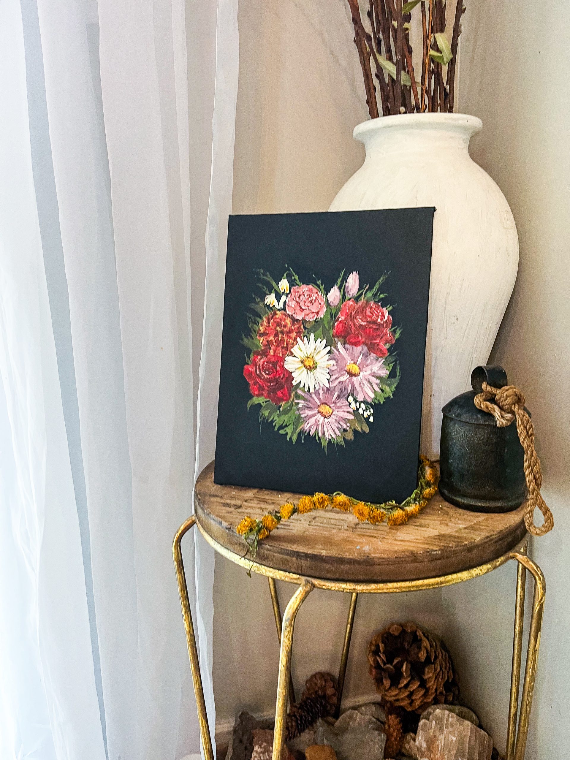 Have you wanted original fine art? Give the gift a personalized hand painted Custom Birth Flower Bouquet Painting. Each piece includes the birth flower of your family. Have this beautiful custom piece in your home. Price is for a 8 X 10 flat canvas painted in high quality acrylics. Painting comes signed with a personal note from the artist. Feel free to email me for pricing for custom sizes and canvas styles. hello@canaryjane.com