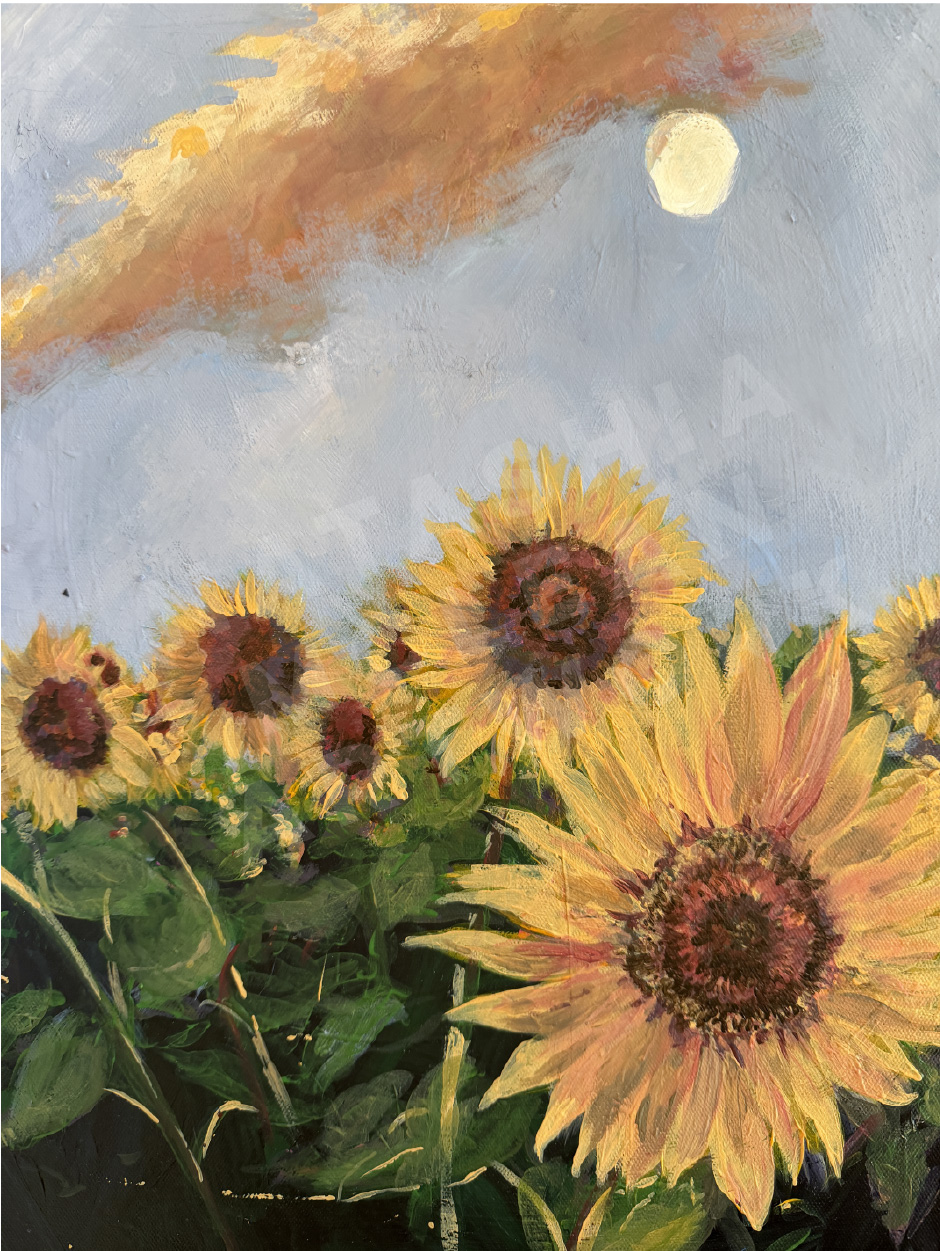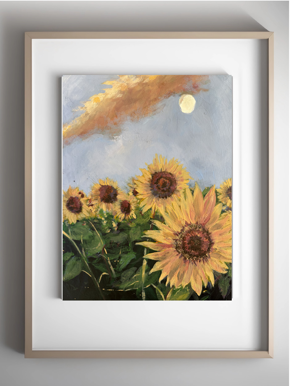 I painted this Moon and Sunflower as a present to my parents for their 40th wedding anniversary. The Moon and Sun often symbolize men and women and our natural cycles. My mother has always been interested in the sun and moon. It carries deep symbolism for her as her late sister loved sunflowers. Enjoy this print of the Moon beaming brightly among the sunflowers.