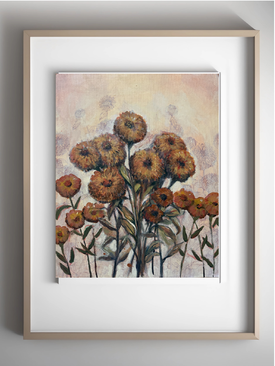 I painted this Moon and Sunflower as a present to my parents for their 40th wedding anniversary. The Moon and Sun often symbolize men and women and our natural cycles. My mother has always been interested in the sun and moon. It carries deep symbolism for her as her late sister loved sunflowers. Enjoy this print of the Moon beaming brightly among the sunflowers.